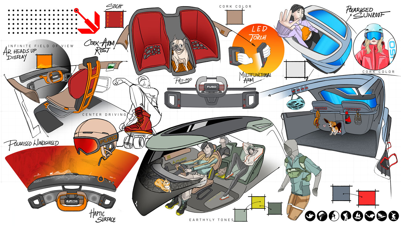 Using these personas, the team developed CMF theme boards, focusing on sustainable materials like cork, recycled leather, bamboo fabric, and jute. Graphics for each variant were inspired by natural terrains: dunes for “Ignite,” tree rings for “Terra,” and glaciers for “Breeze.”