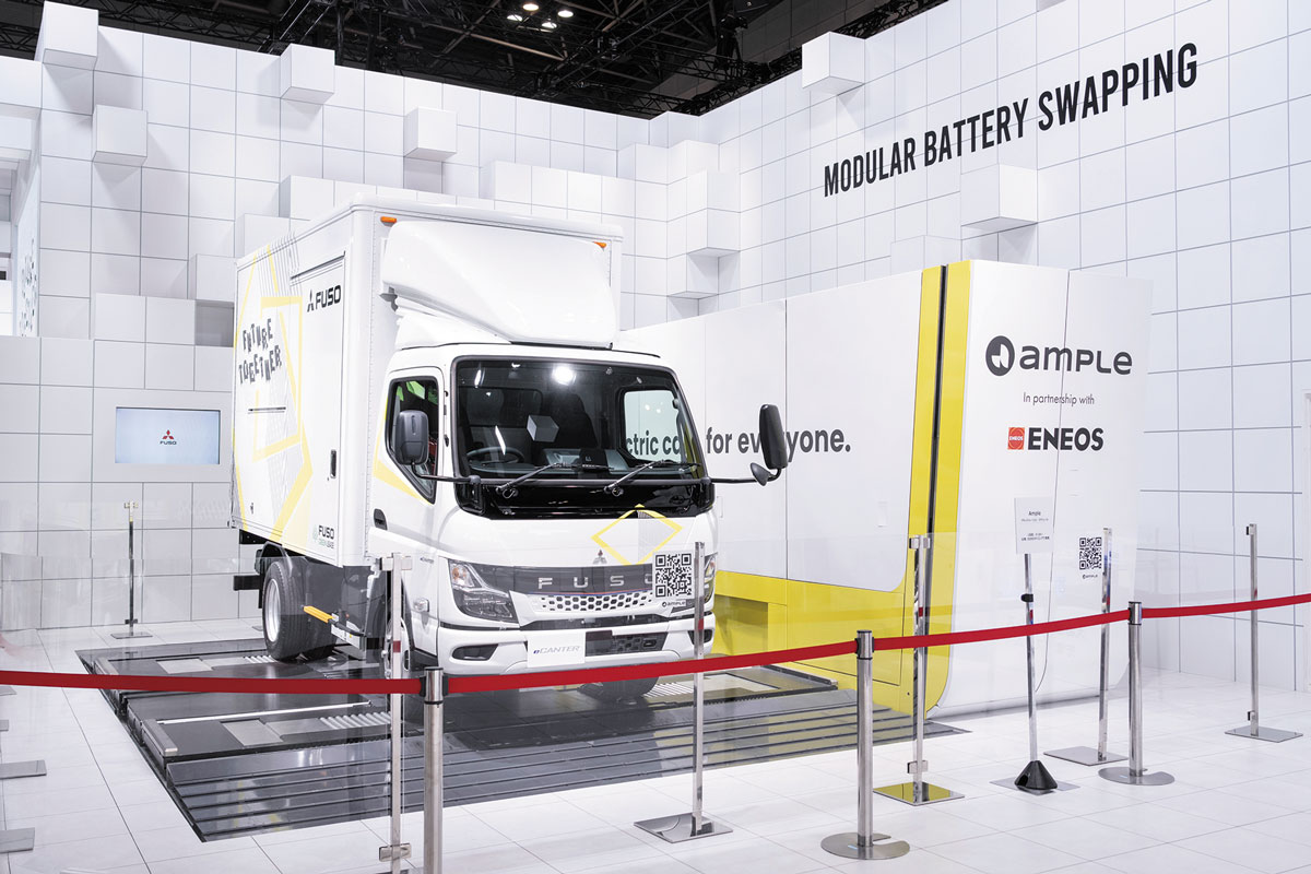 BATTERY SWAPPING STATION  Together with U.S.-based firm, Ample, FUSO demonstrated a battery swapping station. When the eCanter equipped with Ample’s module arrived, the robot went into action, automatically replacing the battery in just a few minutes.