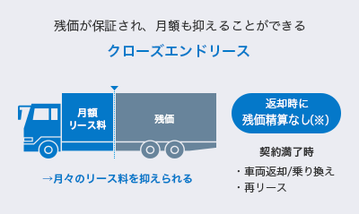 リース契約満了時に設定された残価が保証されるプランです。返却時の残価精算はありません(※)。月々のリース料をおさえられるこちらの商品がおすすめです。