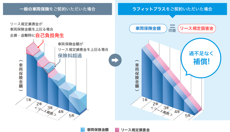 リース契約車両の場合、全損・盗難時にリース会社に対して規定損害金の支払が発生します。一般の車両保険をご契約の場合、車両保険の金額と規定損害金の過不足が発生し、自己負担が発生することもあります。ラフィットプラスの場合は「リースカー車両費用補償特約」で規定損害金が車両保険金額を上回る場合でも補償します。
