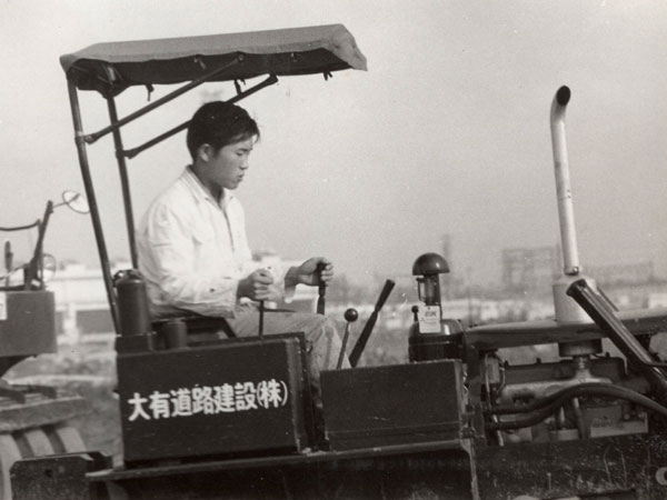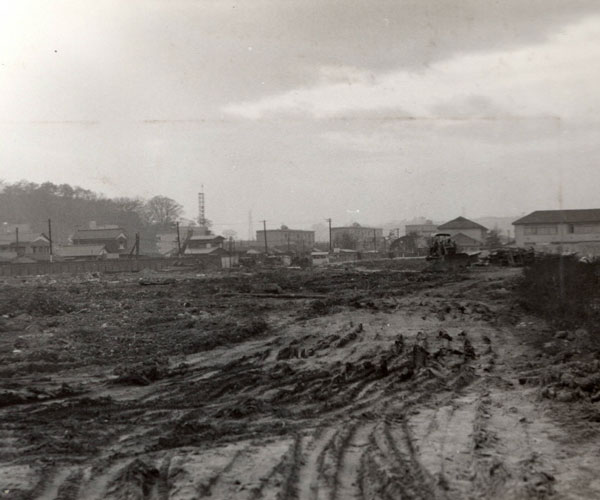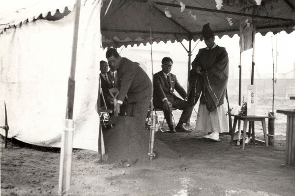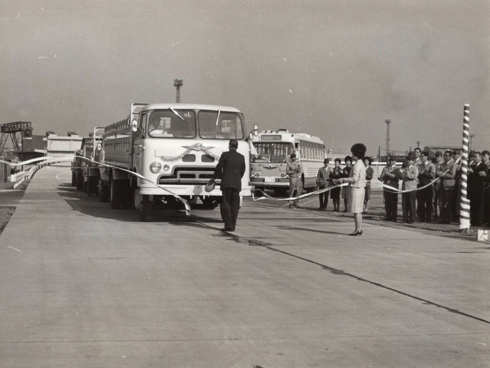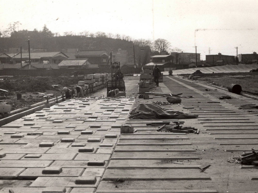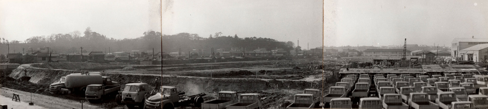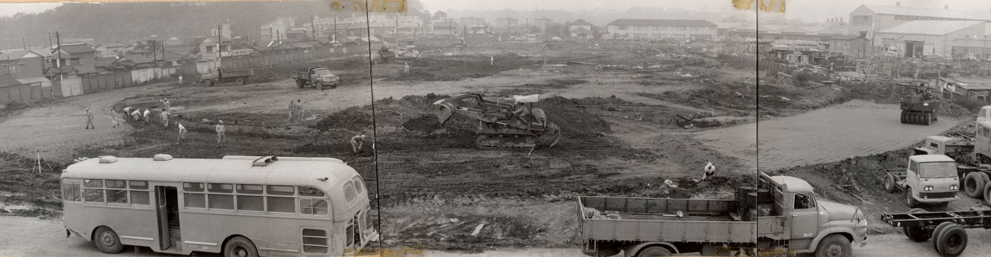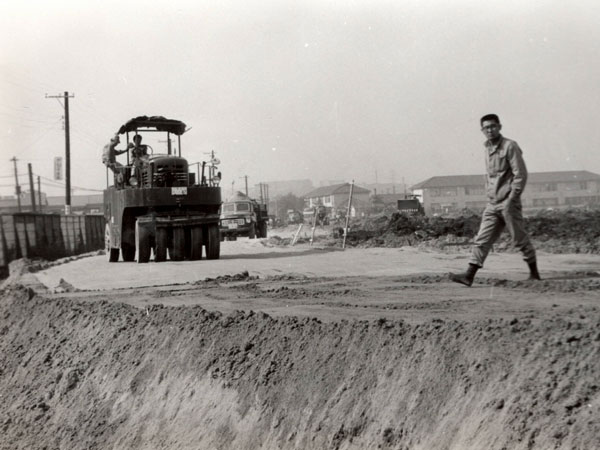 社内の過去文献を探っていると、この三菱ふそうテストコースの建設を記録した白黒写真のアルバムを発見しました。1964年の起工式から始まるこれらの写真には、希望を胸にテストコースを設置する先代の情熱と職人技が捉えられています。