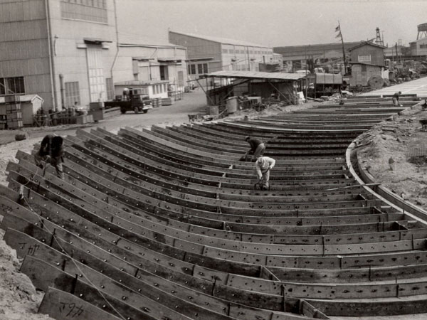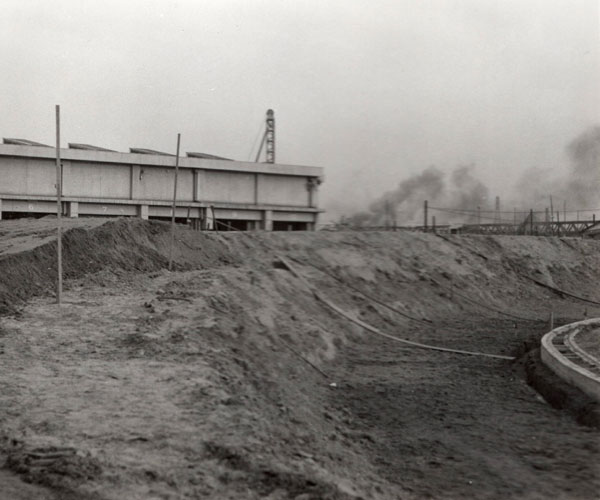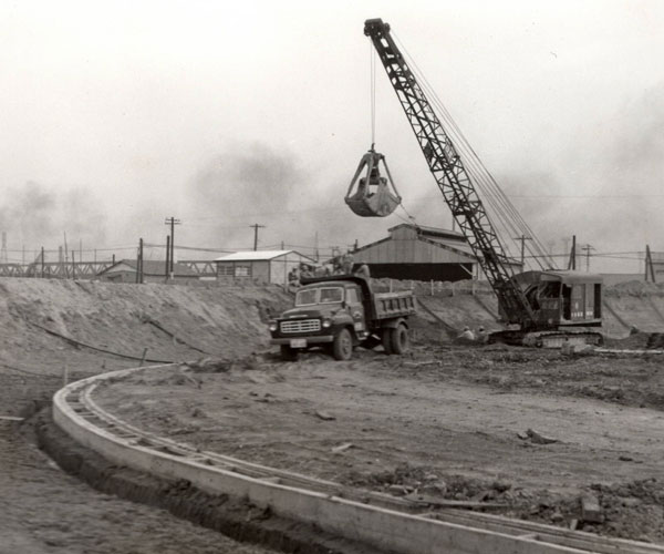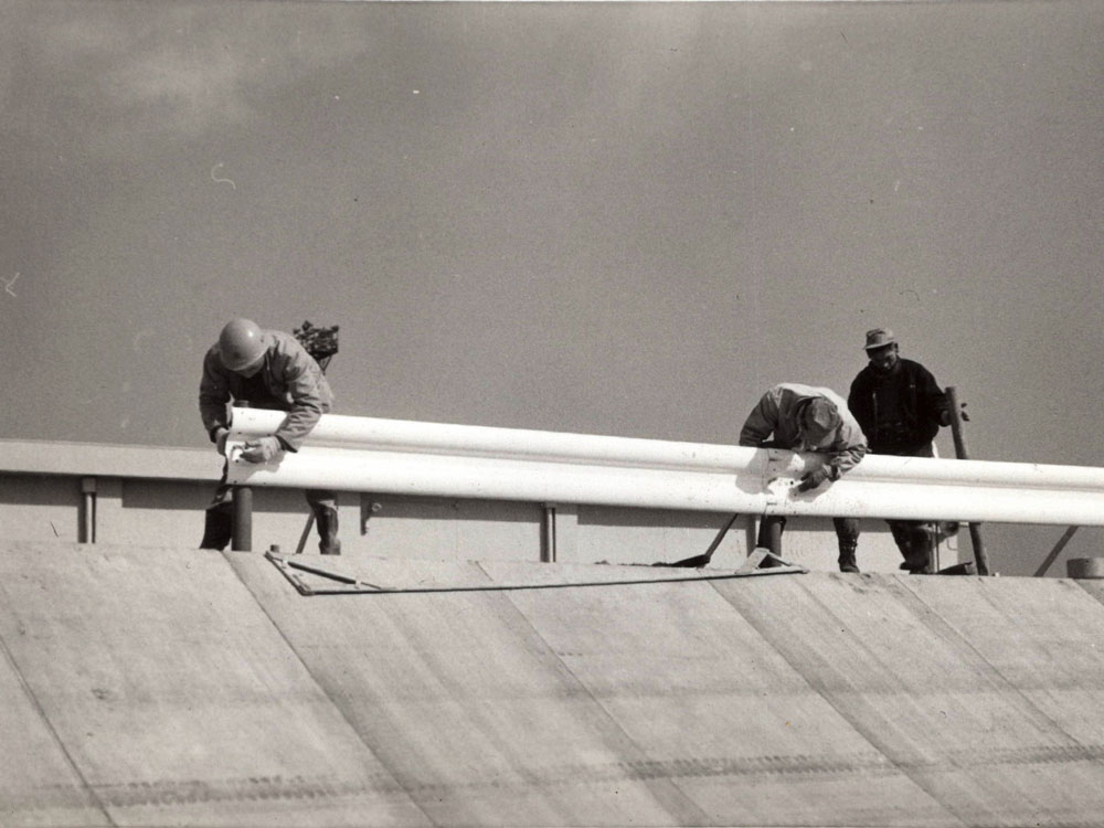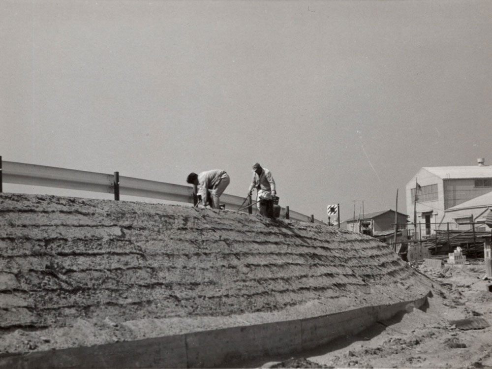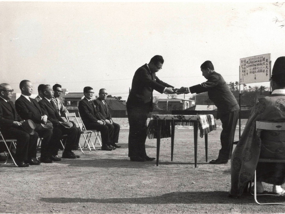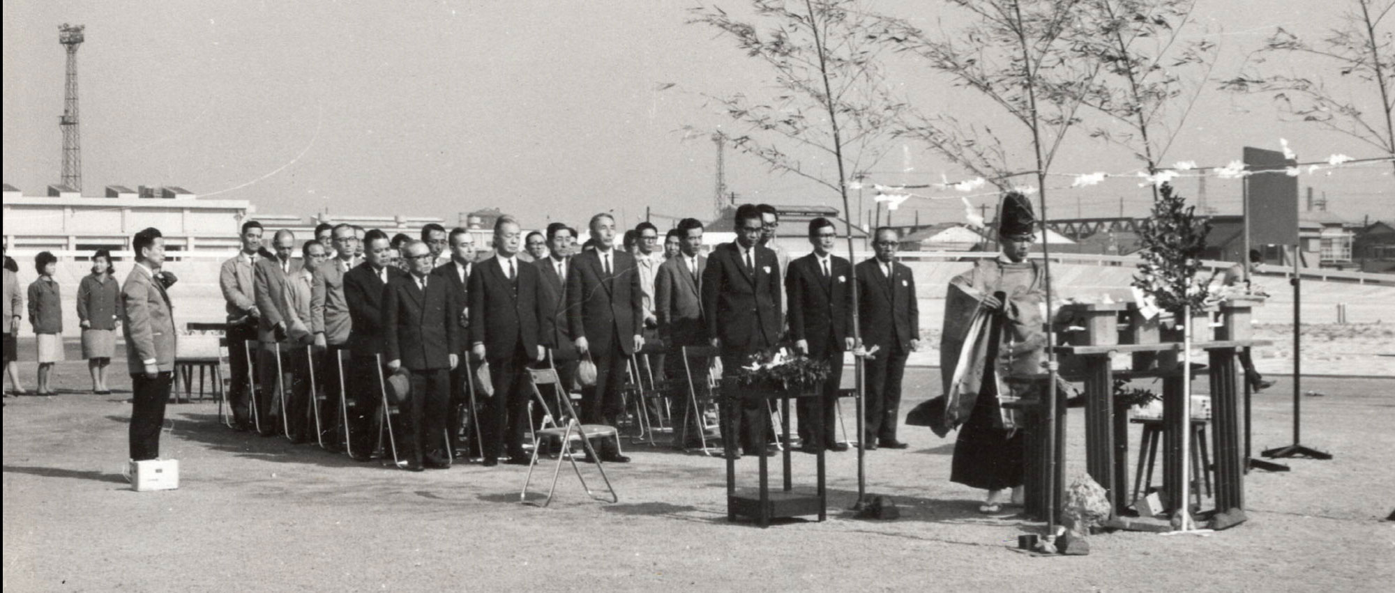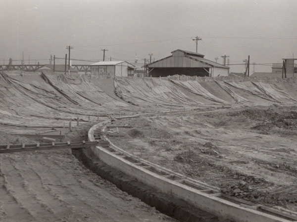 社内の過去文献を探っていると、この三菱ふそうテストコースの建設を記録した白黒写真のアルバムを発見しました。1964年の起工式から始まるこれらの写真には、希望を胸にテストコースを設置する先代の情熱と職人技が捉えられています。