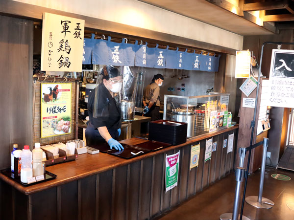 昔ながらの雰囲気が魅力で飽きの来ない館内。写真は珍しい軍鶏鍋料理が楽しめる「五鉄」。