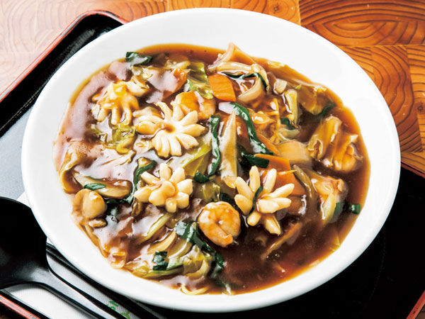 海の幸とたっぷりの野菜を特製タレで絡めた海鮮黒醤油あんかけ麵が人気No.1。