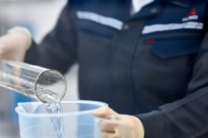 国内では依然として市販消毒剤の不足が続く状況であり、MFTBCは川崎地区の病院と市役所に合計200 リットルの消毒液を寄付することを決定しました。当消毒液は、工場敷地内で品質マネージメント本部が管理する施設内のマテリアルラボを利用して生産しています。制御した環境下であるマテリアルラボは、通常自動車部品に用いる材料の特性を研究しています。同施設は2017年 12月に開設し、最高水準の測定精度を可能にする最先端の機材が揃っています。その為、当ラボを利用して安全にエタノール、グリセリンと精製水を結合させ消毒液を生産することが可能です。