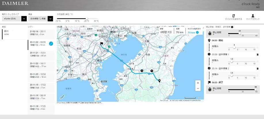 シミュレーションを行うためには、「eTruck Ready App」をインストールしたモバイル端末を検証対象のトラック内に置く必要があります。アプリは車両位置、速度、加速度、高度などのデータを走行中に収集し、その情報をクラウド上の「eTruck Ready System」に送信します。算出されたシミュレーション結果は、専用ウェブサイトを通じてフリート管理者が確認できます。これにより、「eCanter」が1回の充電で通常の走行ルートをどの程度カバーできるのかについて詳細な分析が可能です。さらに、架装、外気温、積載量、アイドリング時間などを設定することで、より正確なシミュレーションが可能です。