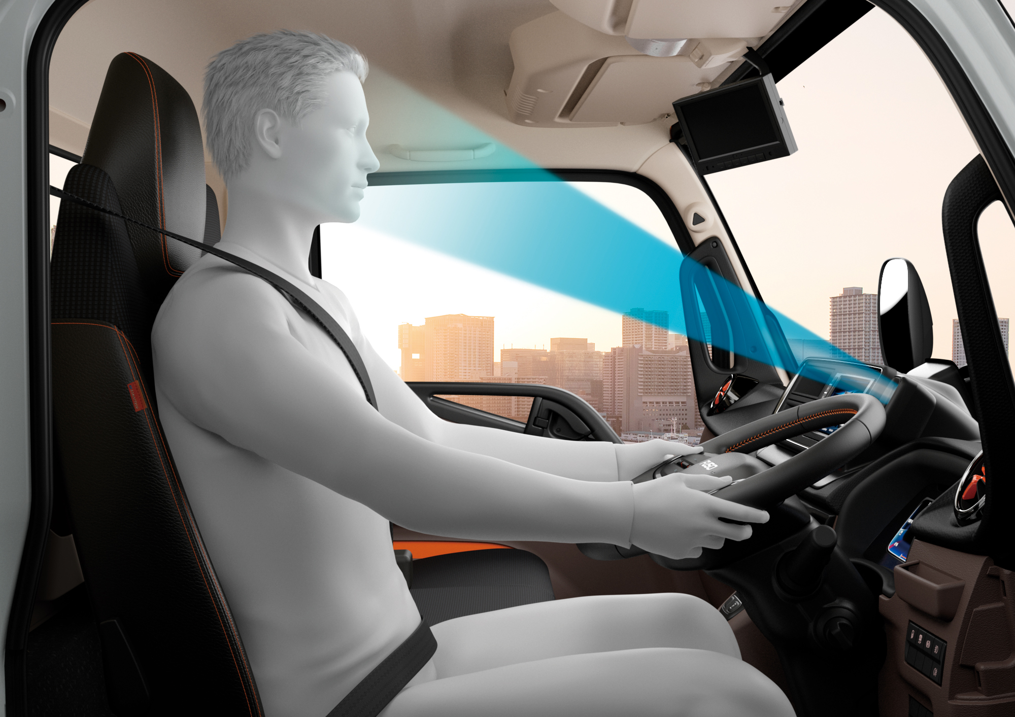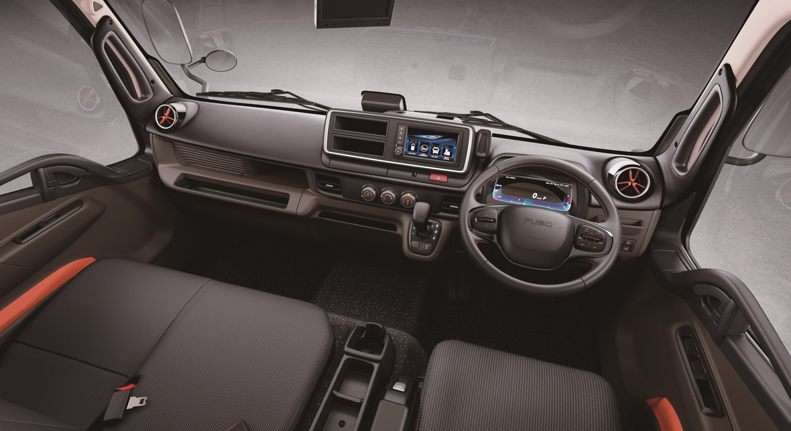 • 内装デザインも快適な運転のためにアップグレードしました。高さを抑え、広々した空間を提供する新形状のダッシュボード、上下寸法を広げ、より多くのお客様への使い勝手を向上させた乗降グリップ、随所にキーカラーのオレンジとブルーを配したほか、ステアリングスイッチと連動した10インチのフル液晶メーターを新たに搭載しました。FUSO小型トラックで採用した「FUSOイージーアクセスキー」も搭載し、利便性もアップしました。