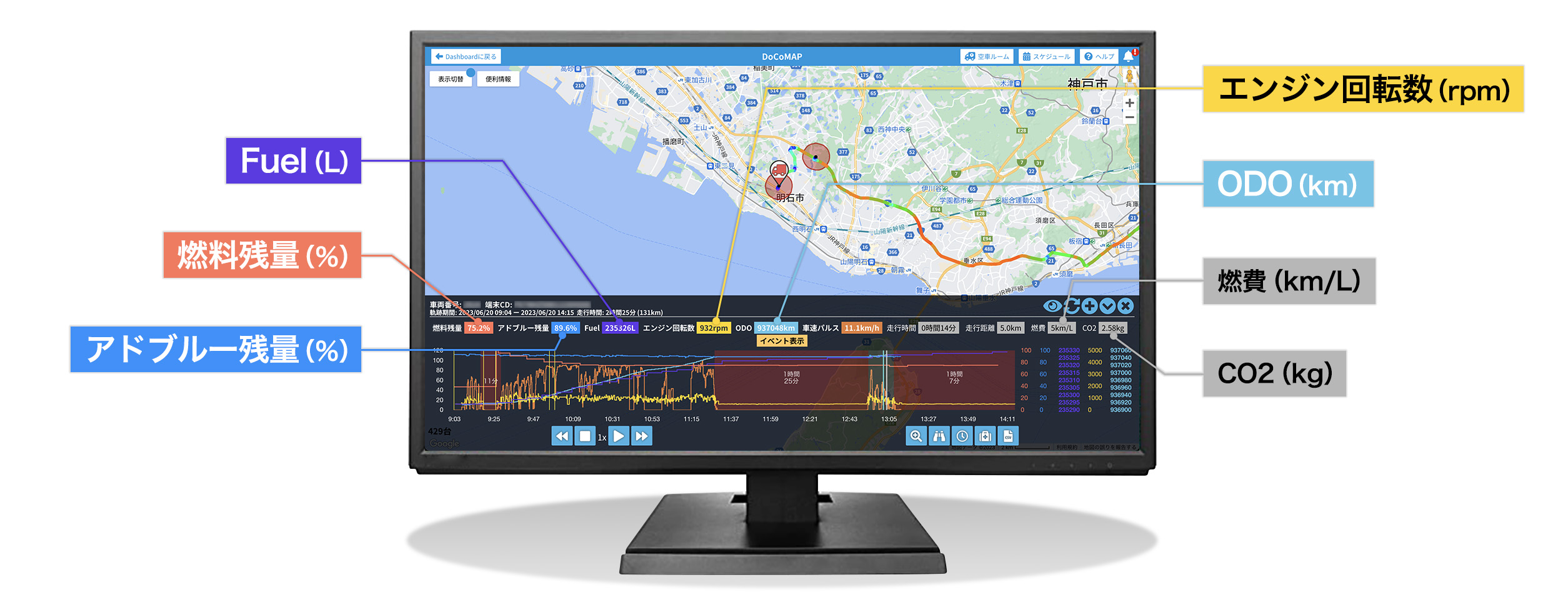 今回新たに提供するグリーンプランでは、対象車両の位置情報や走行履歴、車両の速度表示などベーシックプランの機能に加え、環境問題に取り組む企業へのサポートを充実すべく、燃料消費量や平均燃費、さらにはCO2排出量の見える化を実現し、サステナブル(持続可能)な運送業を目指す企業の取引先や自治体への環境負荷等の報告書提出の省力化にも貢献します。環境に配慮した輸送へのシフトが進む中で、これらの機能は運行管理者の作業時間や負担の軽減にも貢献します。