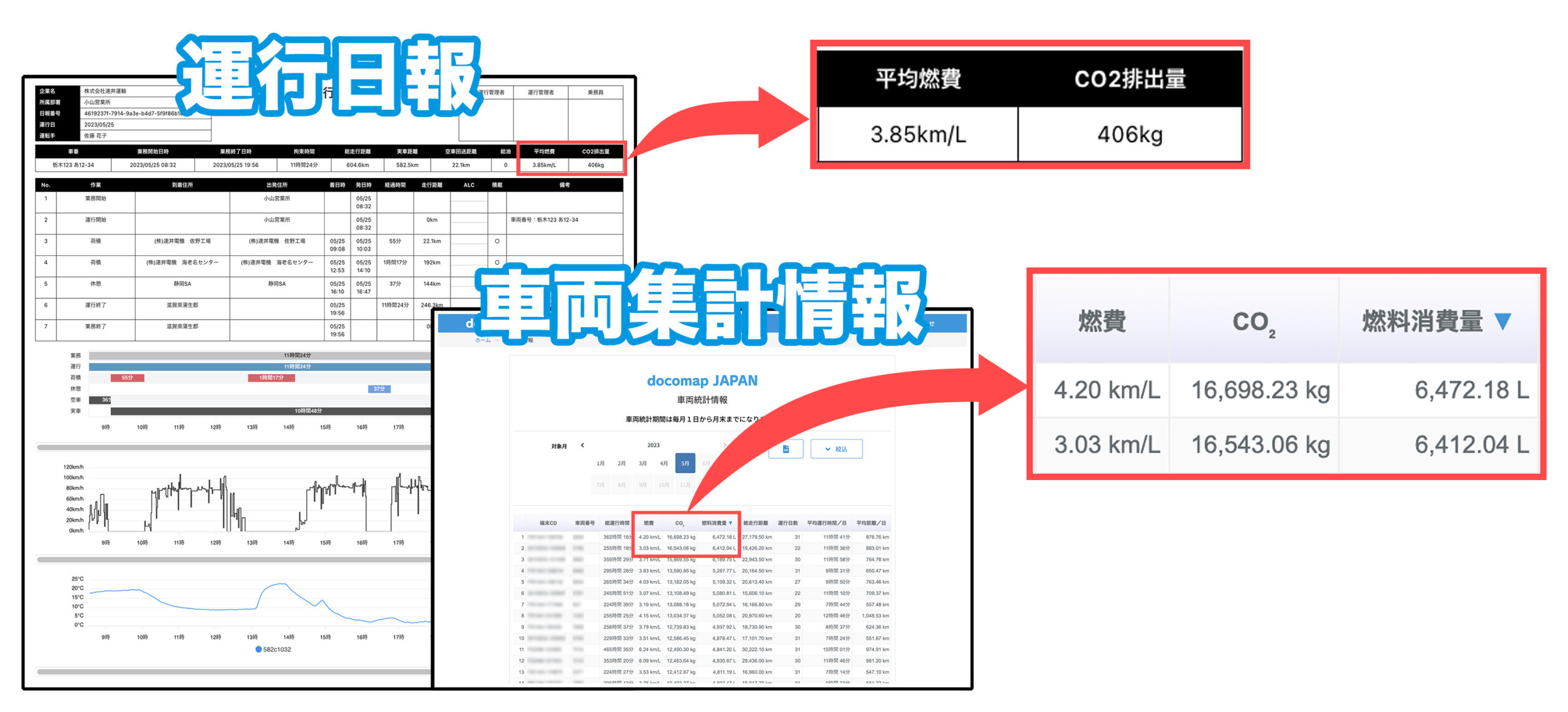 ※運行日報 / 統計情報に表示される「平均燃費」「CO2排出量」「燃料消費量」のイメージ