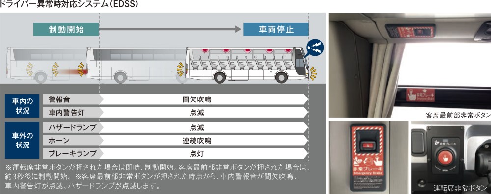 ドライバーに異常が発生した場合に、運転席左側と客席最前部にある非常ボタンにより車両を緊急停止する安全装置です。システムが作動すると車内外へ音と光で警告するとともに、車両が徐々に減速し、周囲に緊急停止を報知します。また、システム作動時はテレマティクスサービス「バスコネクト®(BusConnect®)」を通じて運行管理者へ緊急連絡します。
