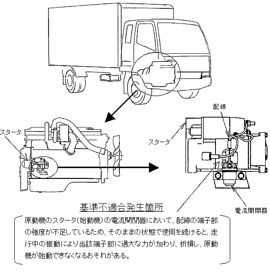| 基準不適合状態にあると認める構造、装置又は性能の状況及びその原因 | 原動機のスタータ(始動機)の電流開閉器において、配線の端子部の強度が不足しているため、そのままの状態で使用を続けると、走行中の振動により当該端子部に過大な力が加わり、折損し、原動機が始動できなくなるおそれがある。 |