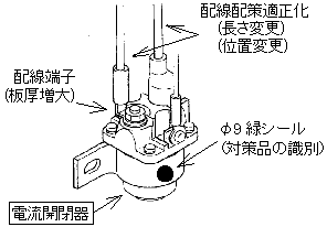 | 改善措置の内容 | 対策品の供給に時間を要するため、当面の暫定措置として、全車両、電流開閉器の配線端子部を点検し、亀裂・折損等異常があるものについては良品と交換する。また、後日全車両、当該開閉器を対策品と交換する。 |