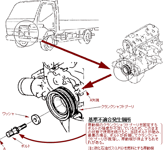 原動機のクランクシャフトプーリを固定するボルトの強度が不足しているため、このままの状態で使用を続けると、当該ボルトが弛み、最悪の場合、ボルトが折損してクランクシャフトプーリが脱落し、原動機が停止するおそれがある。 | ||