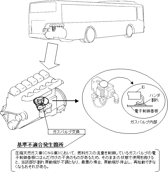 燃料ガスの流量を制御しているガスバルブの電子制御基板にはんだ付けの不良のものがあるため、そのままの状態で使用を続けると、 当該部が割れ原動機が不調となり、最悪の場合、原動機が停止し、再始動できなくなるおそれがある。 | ||