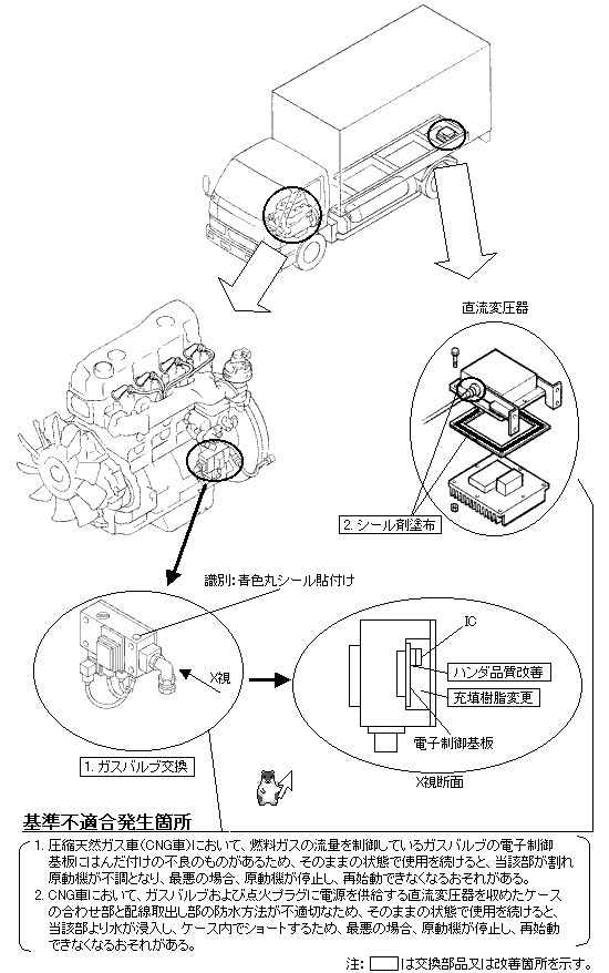 | 改善の内容 1. 全車両、ガスバルブを対策品に交換する。 2.全車両、直流変圧器のケース合わせ部と配線取出し部にシール剤を塗布する。 識別 改善済車両については、ガスバルブに青色丸シールを貼付ける。 |