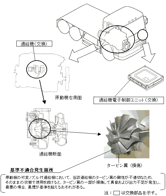 | 改善の内容;全車両、当該過給機および過給機電子制御ユニットを対策品に交換する。