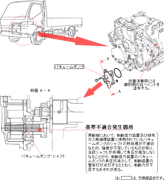 原動機において、制動倍力装置及び排気ガス再循環装置に使用されているバキュームポンプのシャフトの熱処理が不適切なため、強度が不足しているものがあり、 当該シャフトが折損して負圧が発生しなくなることから、制動倍力装置のバキュームタンクの負圧が減少して、制動装置の警告灯が点灯するとともに、制動力が不足するおそれがある。 |