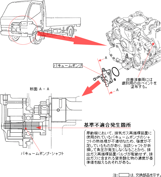 原動機において、排気ガス再循環装置に使用されているバキュームポンプのシャフトの熱処理が不適切なため、強度が不足しているものがあり、 当該シャフトが折損して負圧が発生しなくなることから、排出ガス再循環装置バルブが駆動せず、排出ガスに含まれる窒素酸化物の濃度が基準値を超えるおそれがある。 |