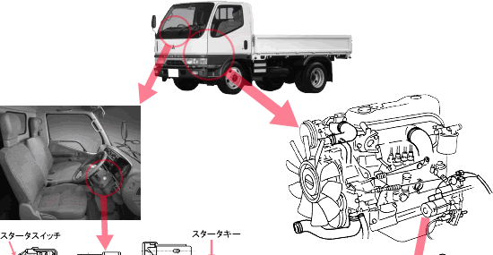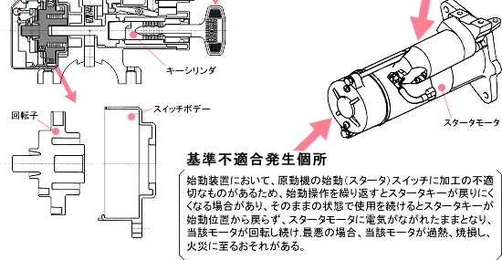 そのままの状態で使用を続けるとスタータキーが始動位置から戻らず、スタータモータに電気が流れたままとなり、当該モータが回転し続け、最悪の場合、当該モータが過熱、焼損し、 火災に至るおそれがある。 |