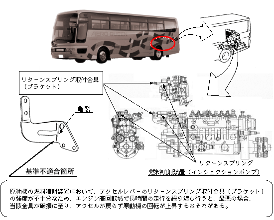 原動機の燃料噴射装置において、アクセルレバーのリターンスプリング取付金具(ブラケット)の強度が不十分なため、エンジン高回転域で長時間の走行を繰り返し行うと、最悪の場合、当該金具が破損に至り、アクセルが戻らず原動機の回転が上昇するおそれがある。
