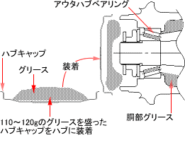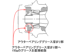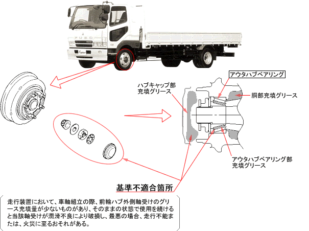 走行装置において、車軸組立の際、前輪ハブ外側軸受けのグリース充填量が少ないものがあり、そのままの状態で使用を続けると当該軸受けが潤滑不良により破損し、最悪の場合、 走行不能または、火災に至るおそれがある。 |