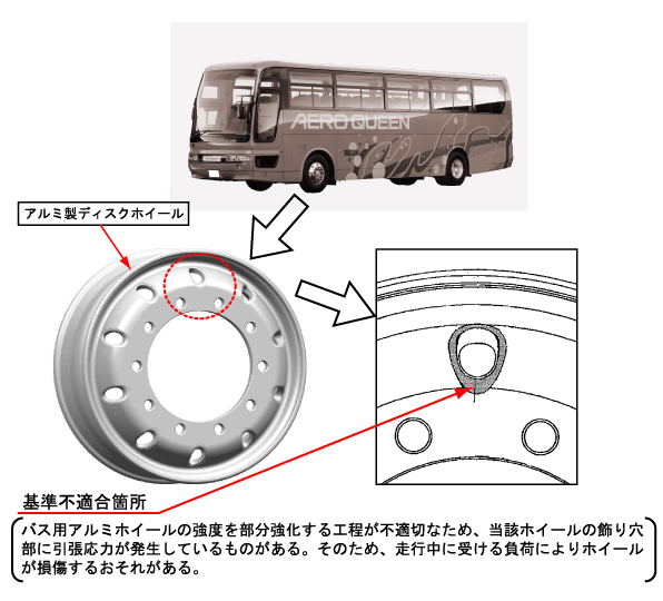 バス用アルミホイールの強度を部分強化する工程が不適切なため、当該ホイールの飾り穴部に引張応力が発生しているものがある。そのため、走行中に受ける負荷によりホイールが損傷するおそれがある。 |