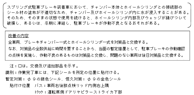改善措置の内容 全車両、ブレーキチャンバー一式とホイールシリンダ一式を対策品と交換する。