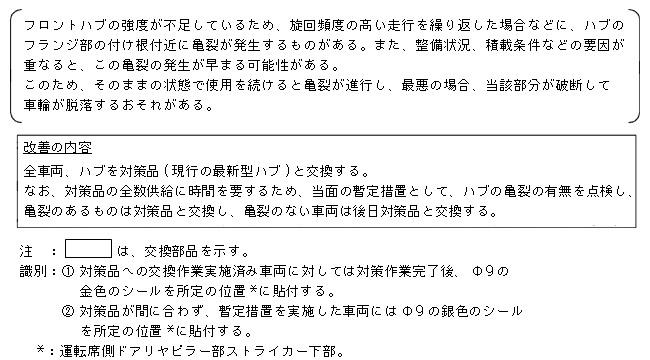改善措置の内容 全車両、ハブを対策品(現行の最新型ハブ)と交換する。