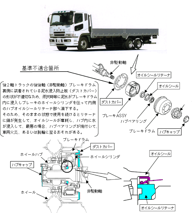 後2軸トラックの後後軸(非駆動軸)ブレーキドラム裏側に装着されている泥水浸入防止板(ダストカバー)の形状が不適切なため、雨天時等に泥水がブレーキドラム内に浸入しブレーキのホイールシリンダを伝って内側のハブオイルシールリテーナ部へ滴下する。