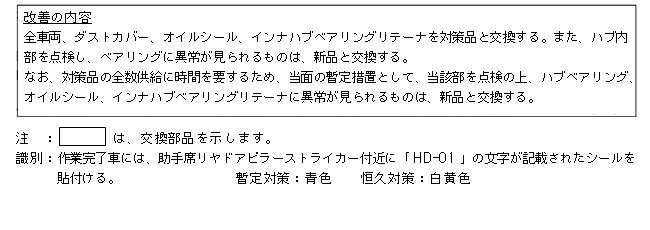 なお、対策品の全数供給に時間を要するため、当面の暫定措置として、当該部を点検の上、ハブベアリング、オイルシール、インナハブベアリングリテーナに異常が見られるものは、新品と交換する。