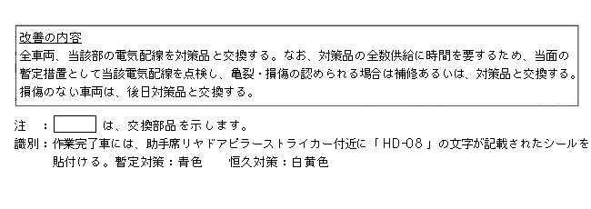改善措置の内容 全車両、当該部の電気配線を対策品と交換する。なお、対策品の全数供給に時間を要するため、当面の暫定措置として当該電気配線を点検し、亀裂・損傷の認められる場合は補修あるいは、対策品と交換する。損傷のない車両は、後日対策品と交換する。