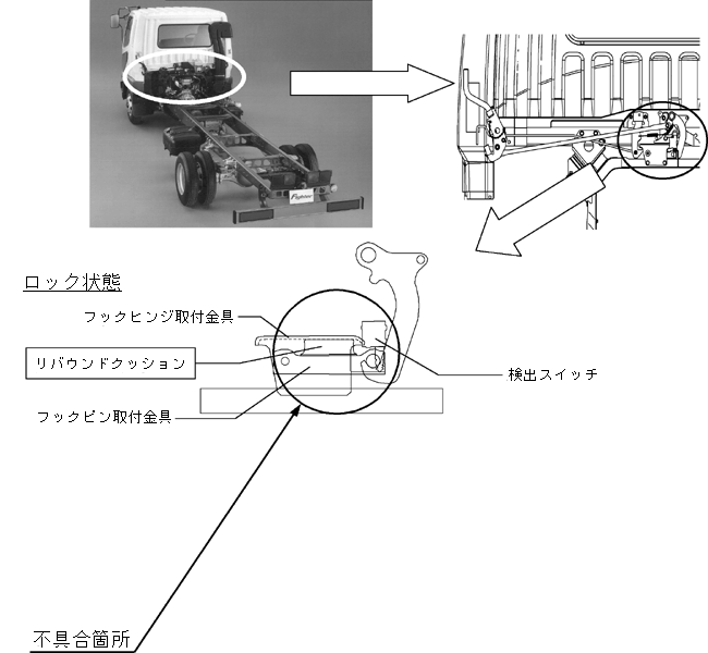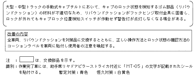 大型・中型トラックの手動式キャブチルトにおいて、キャブのロック状態を検知するゴム部品(リバウンドクッション)の材料が不適切なため、リバウンドクッションがフックヒンジ取付金具に固着し、ロックが外れてもキャブロック位置検知スイッチが作動せず警告灯が点灯しなくなる場合がある。