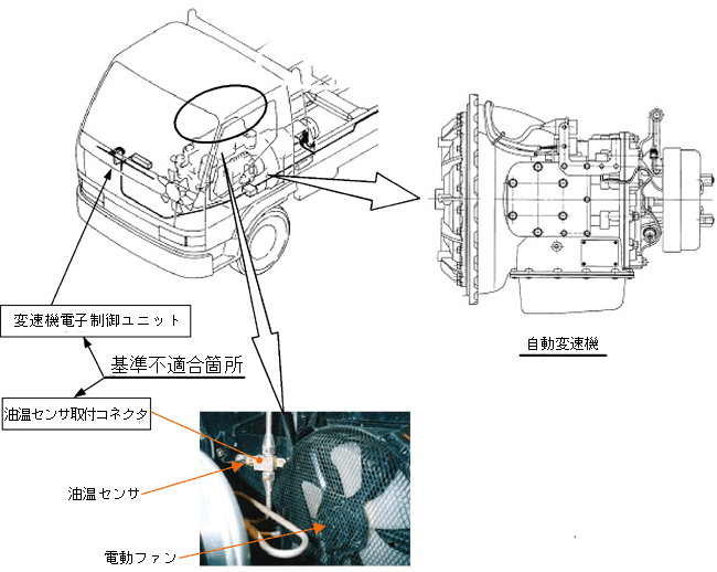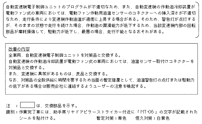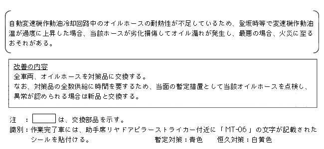 | 改善措置の内容 | 全車両、オイルホースを対策品に交換する。なお、対策品の全数供給に時間を要するため、当面の暫定措置として当該オイルホースを点検し、異常が認められる場合は新品と交換する。 全車両、自動変速機電子制御ユニットを対策品と交換する。自動変速機の作動油冷却装置が電動ファン式の車両においては、油温センサー取付けコネクターを対策品と交換する。 また、変速機に異常があるものは、良品と交換する。 なお、対策品の全数供給に時間を要するため当面の暫定措置として、油温警告灯の点灯または駆動力の低下がある場合は販売会社に連絡するようユーザーの注意を喚起する。 |