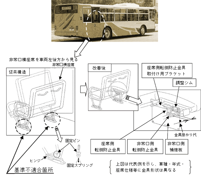 バスの非常口横の前転倒式座席において、座席を固定するピンの保持力が弱い、また、転倒防止金具の取付けバラツキにより掛かり代が不足しているものがある。