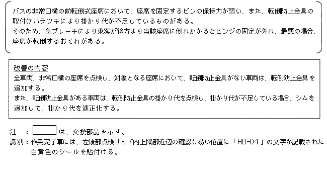 改善措置の内容 全車両、非常口横の座席を点検し、対象となる座席において、転倒防止金具がない車両は、転倒防止金具を追加する、