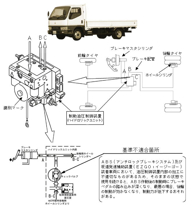 ABS(アンチロックブレーキシステム)及び坂道発進補助装置(EZGO:イージーゴー)装着車両において、油圧制御装置内部の加工に不適切なものがあるため、そのままの状態で使用を続けると、ABS作動後の制動時にブレーキペダルの踏み込みが深くなり、最悪の場合、後輪の制動が効かなくなり、制動力が低下するおそれがある。
