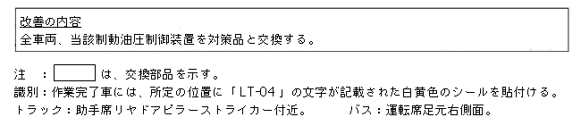 改善措置の内容 全車両、当該制動油圧制御装置を対策品と交換する。