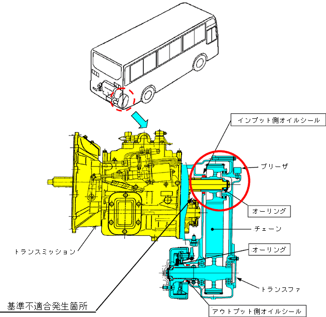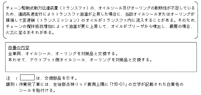 | 改善措置の内容 | 全車両、オイルシール、オ-リングを対策品と交換する。 あわせて、アウトプット側オイルシール、オーリングを対策品と交換する。 |