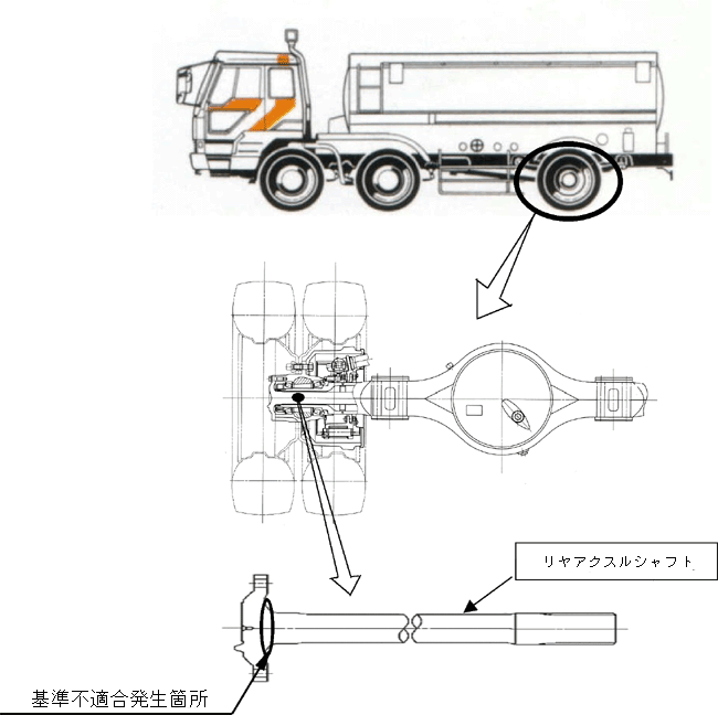 後1軸駆動の大型トラックのリヤアクスルシャフトの材質が不適切なため、発進時の過大入力に対するフランジ根元付近の強度が不足している。 そのため、急発進等の過酷な操作により、当該シャフトが破損し、走行不能となるおそれがある。 |