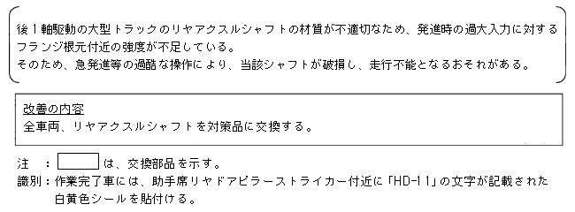 | 改善措置の内容 | 全車両、リヤアクスルシャフトを対策品に交換する。 |