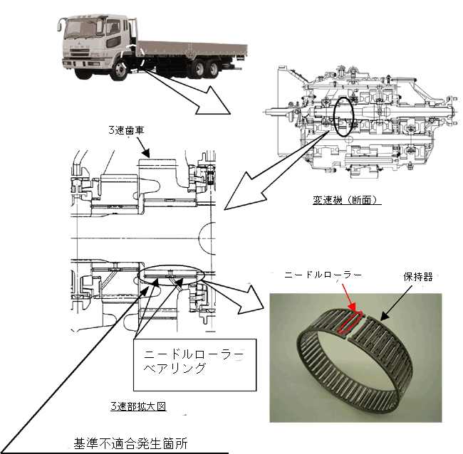 変速機(トランスミッション)内部の3速歯車を支えるベアリング(ニードルローラーベアリング)の保持器の強度が不十分なため、3速の歯車より加わる荷重等により当該保持器が変形・破損することがある。そのため、そのままの状態で使用を続けると、シフト不良、異音等が発生して、最悪の場合、当該ベアリングが焼付き走行不能となるおそれがある。 |