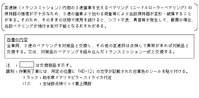 | 改善措置の内容 | 全車両、3速のベアリングを対策品と交換し、その他の変速段は点検して異常があれば対策品と交換する。 又は、対策品のベアリングを組み込んだトランスミッション一式と交換する。 |