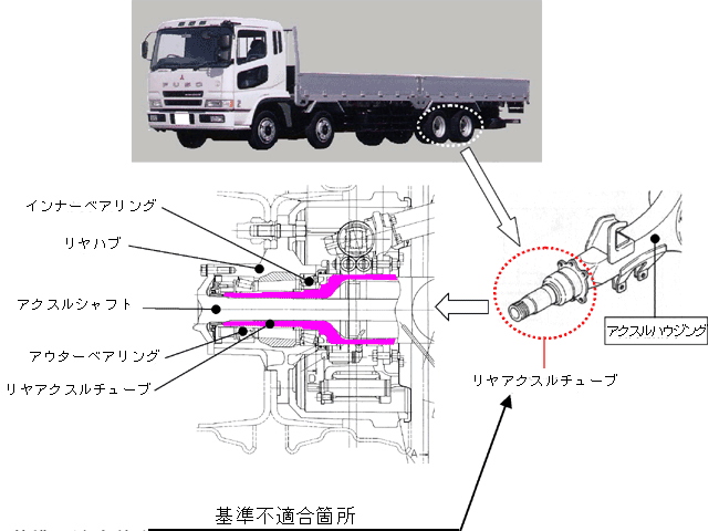 低床式後2軸大型トラックの後軸のアクスルチューブにおいて、鍛造時の金型の管理が不適切なため、当該チューブに傷のついた部品が組み付けられた車両がある。 そのため、路面からの入力等の繰り返しにより当該チューブに亀裂が発生し、最悪の場合、チューブが破断して、走行不能に至るおそれがある。 |