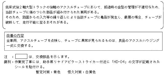 | 改善措置の内容 | 全車両、アクスルチューブを点検し、チューブに異常が見られるものは、良品のアクスルハウジング一式に交換する。 |