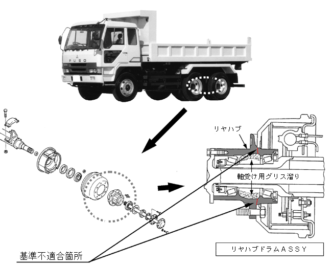 | ふそうザ・グレート、スーパーグレート、エアロキングの走行装置(リヤハブ)について、平成16年12月17日に下記のリコールを国土交通省に届け出ました。ご愛用車の措置について、販売会社から早急にご連絡・ご相談をさせていただきますので、よろしくお願い申し上げます。 ユーザの皆様には大変ご迷惑をおかけいたしますことを、心よりお詫び申し上げます。 |