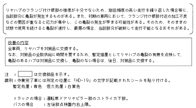 | 改善措置の内容 | 全車両、リヤハブを対策品に交換する。 なお、対策品の全数供給に時間を要するため、暫定措置としてリヤハブの亀裂の有無を点検して、亀裂のあるハブは対策品に交換し、亀裂のない場合は、後日、対策品に交換する 。 |