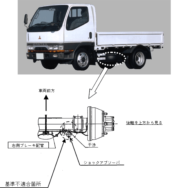 後軸の右側ブレーキ配管の取りまわしが不適切なため、走行中にショックアブソーバと当該ブレーキ配管が干渉するものがある。 そのため、そのままの状態で使用を続けると、当該ブレーキ配管が損傷し、最悪の場合 ブレーキ液が漏れ、制動力が低下するおそれがある。 |