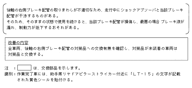 | 改善措置の内容 | 全車両、後軸の右側ブレーキ配管の対策品への交換有無を確認し、対策品が未装着の車両は対策品と交換する。 | ||