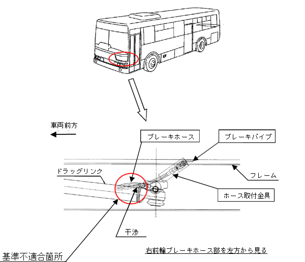 右前輪のブレーキホースの取付金具に異なったものを使用したため、ホースの取り廻しが不適切となり、車体のバウンド時に当該ブレーキホースがドラックリンクに干渉するものがある。そのため、そのままの状態で使用を続けると、ホースが損傷し、最悪の場合、ブレーキ液が洩れて、制動力が低下するおそれがある。