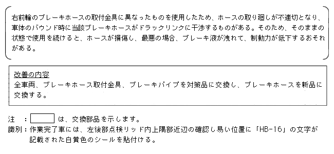 改善措置の内容 全車両、ブレーキホース取付金具、ブレーキパイプを対策品に交換し、ブレーキホースを新品に交換する。